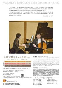 ひしおの秋、「土蔵で聴くチェロの音」も3回目を向かえます。全国、いろんなステージで演奏活動をされている谷口賢記氏ですが、ここひしおホールでの演奏は格別の響きと感じます。また、真庭にて熱心に後進の指導を行っているピアニスト松田美智子氏との息の合った演奏も楽しみです。